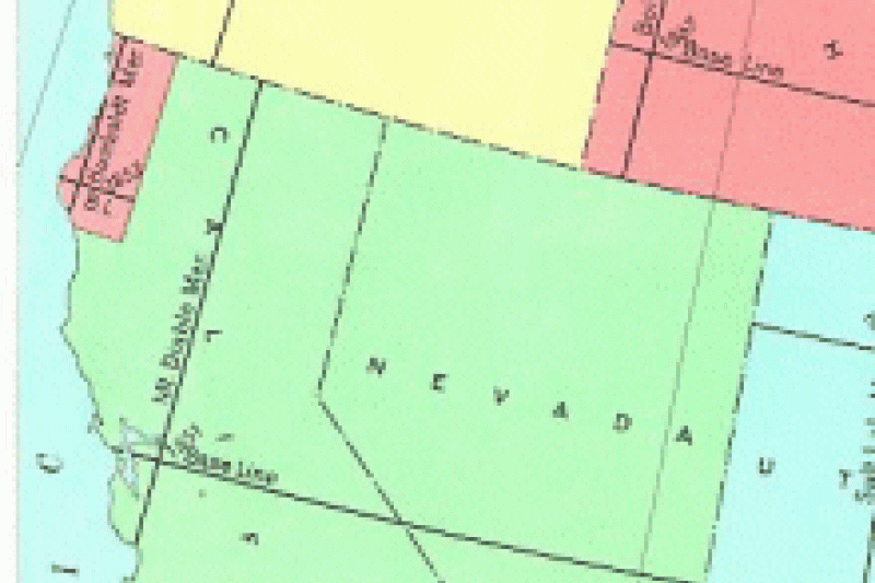 Three initial points, the Mount Diablo Base and Meridian (est. 1851) (center), the San Bernardino Base and Meridian (est. 1852) (bottom), and the Humboldt Base and Meridian (est. 1853) (top) are the starting points for the property grid covering California and Nevada.